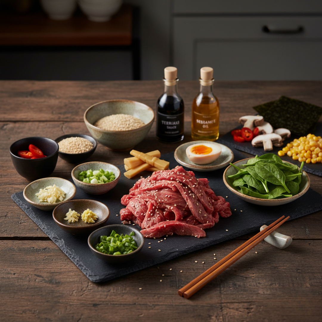 Mit Spinat, glasiertem Teriyaki-Beef, Ei, Sesam, Frühlingszwiebeln und weiteren Toppings nach Wunsch garnieren, z.B. Menma oder Kizami Nori.